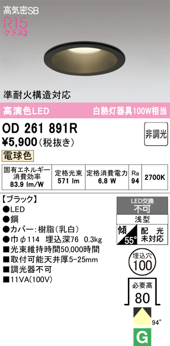 オーデリック OD261891R ダウンライト LED一体型 非調光 電球色 高気密SB 埋込穴φ100 ブラック £ [od261891r]