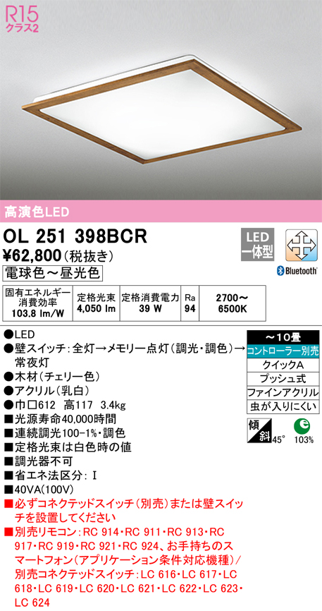 オーデリック OL251398BCR シーリングライト 10畳 調光 調色 Bluetooth リモコン別売 LED一体型 電球色〜昼光色 チェリー [♭]