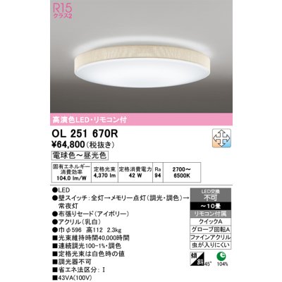 オーデリック OL251670R シーリングライト 10畳 調光 調色 リモコン付属 LED一体型 電球色〜昼光色 アイボリー [♭] [ol251670r]