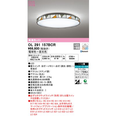 オーデリック OL291157BCR シーリングライト 12畳 調光 調色 Bluetooth リモコン別売 LED一体型 電球色〜昼光色 ステンド調 [♭]