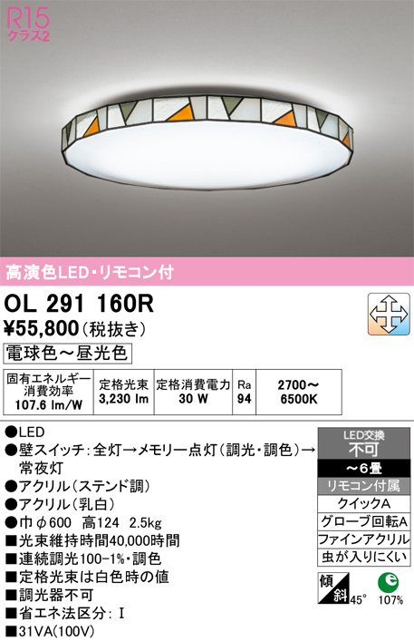オーデリック OL291160R シーリングライト 6畳 調光 調色 リモコン付属 LED一体型 電球色〜昼光色 ステンド調 [♭] [ol291160r]