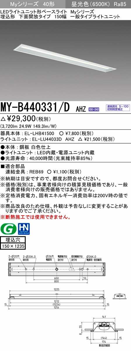 三菱 MY-B440331/D AHZ LEDライトユニット形ベースライト 埋込形 下面開放 150幅 一般タイプ 初期照度補正付連続調光 昼光色 受注生産品 [§] [my-b440331-dahz]