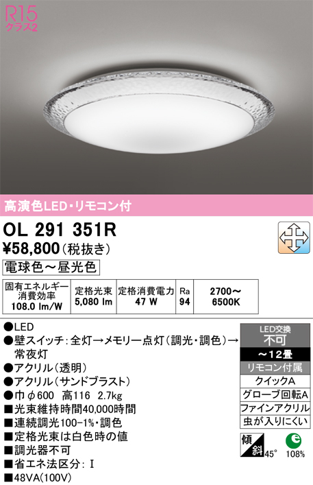 オーデリック OL291351R シーリングライト 12畳 調光 調色 リモコン付属 LED一体型 電球色〜昼光色 [♭] [ol291351r]