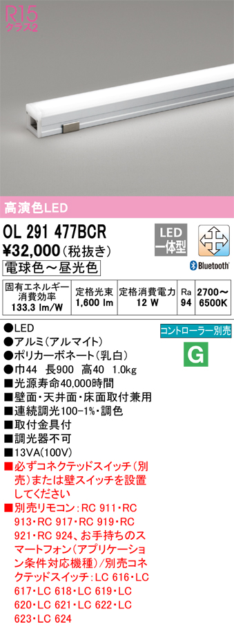 オーデリック OL291477BCR 間接照明 調光 調色 Bluetooth リモコン別売 LED一体型 電球色〜昼光色 屋内用 長900 オフホワイト £ [ol291477bcr]