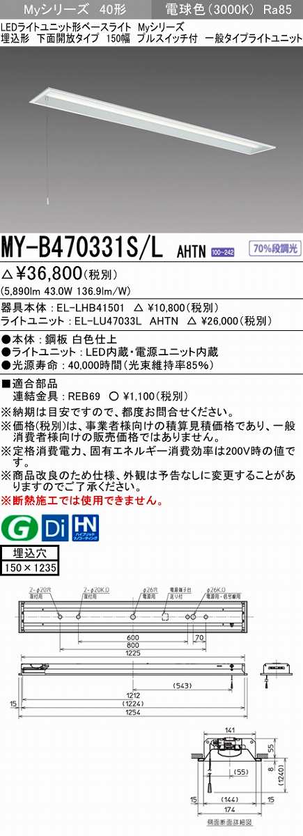 三菱 MY-B470331S/L AHTN LEDライトユニット形ベースライト 埋込形 下面開放 150幅 プルスイッチ付 一般タイプ 固定出カ 電球色 受注生産品 [§]