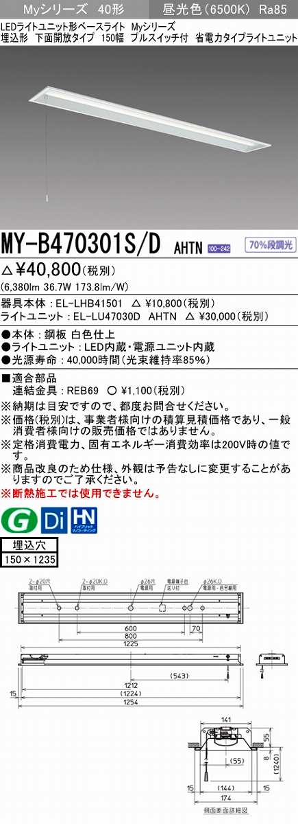 三菱 MY-B470301S/D AHTN LEDライトユニット形ベースライト 埋込形 下面開放 150幅 プルスイッチ付 省電力タイプ 固定出カ 昼光色 受注生産品 [§] [my-b470301s-dahtn]