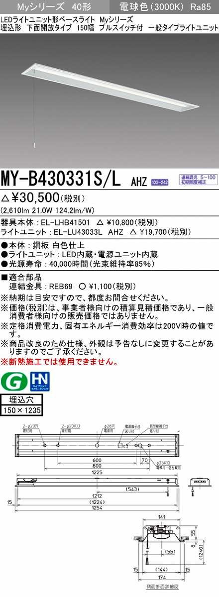 三菱 MY-B430331S/L AHZ LEDライトユニット形ベースライト 埋込形 下面開放 150幅 プルスイッチ付 一般タイプ 初期照度補正付連続調光 電球色 受注生産 [§]