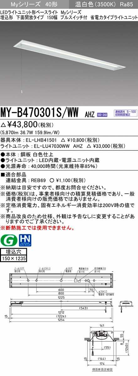 三菱 MY-B470301S/WW AHZ LEDライトユニット形ベースライト 埋込形 下面開放 150幅 プルスイッチ付 省電力 初期照度補正付連続調光 温白色 受注生産 [§]