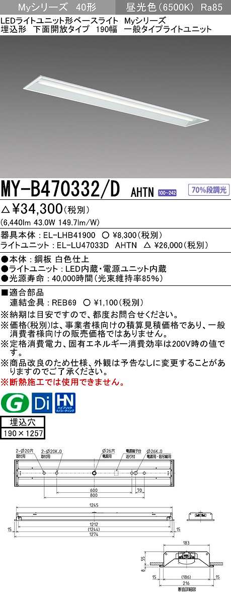 三菱 MY-B470332/D AHTN LEDライトユニット形ベースライト 埋込形 下面開放 190幅 一般タイプ 固定出カ 昼光色 受注生産品 [§] [my-b470332-dahtn]