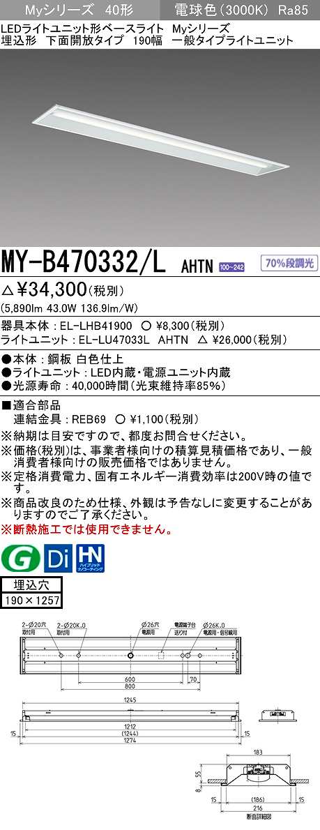 三菱 MY-B470332/L AHTN LEDライトユニット形ベースライト 埋込形 下面開放 190幅 一般タイプ 固定出カ 電球色 受注生産品 [§] [my-b470332-lahtn]