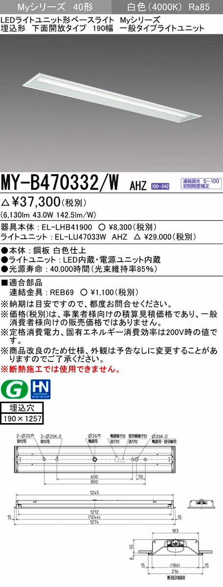 三菱 MY-B470332/W AHZ LEDライトユニット形ベースライト 埋込形 下面開放 190幅 一般タイプ 初期照度補正付連続調光 白色 受注生産品 [§] [my-b470332-wahz]