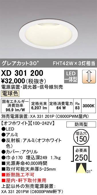 オーデリック XD301200 ダウンライト 埋込穴φ150 電源装置・調光器・信号線別売 LED一体型 電球色 高天井用 防雨型 オフホワイト