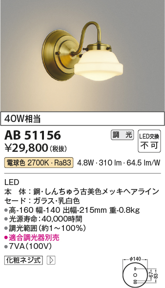 コイズミ照明 AB51156 ブラケット 調光 調光器別売 LED一体型 電球色 真鍮 [ab51156]