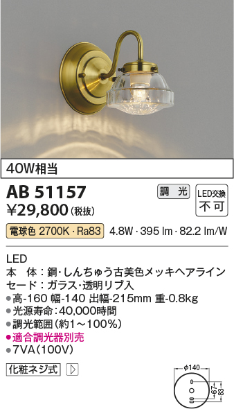 コイズミ照明 AB51157 ブラケット 調光 調光器別売 LED一体型 電球色 真鍮
