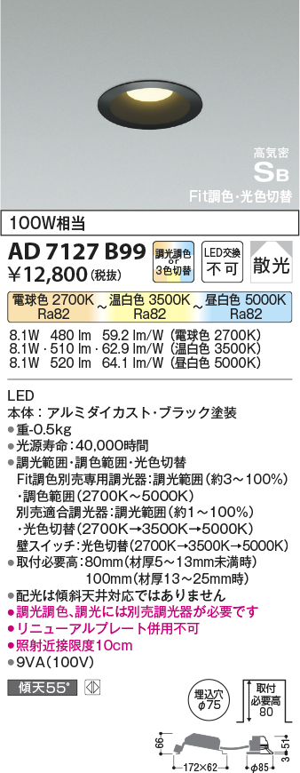 コイズミ照明 AD7127B99 ダウンライト φ75 Fit調色・光色切替 3光色切替 調光器別売 LED一体型 電球色+昼白色 高気密SB ベースタイプ 散光 [ad7127b99]