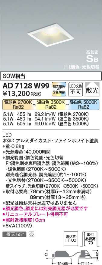 コイズミ照明 AD7128W99 ダウンライト □100 Fit調色・光色切替 3光色切替 調光器別売 LED一体型 電球色+昼白色 高気密SB ベースタイプ散光 [ad7128w99]