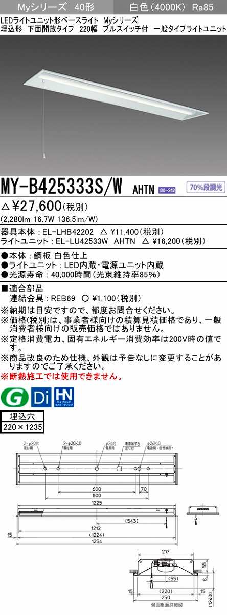 三菱 MY-B425333S/W AHTN LEDライトユニット形ベースライト 埋込形下面開放タイプ220幅プルスイッチ付 一般タイプ 固定出力 白色 受注生産品 [§] [my-b425333s-wahtn]