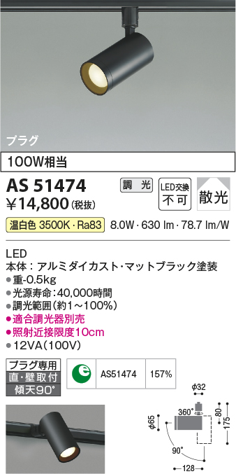 コイズミ照明 AS51474 スポットライト 調光 調光器別売 LED一体型 温白色 散光 プラグタイプ マットブラック [as51474]