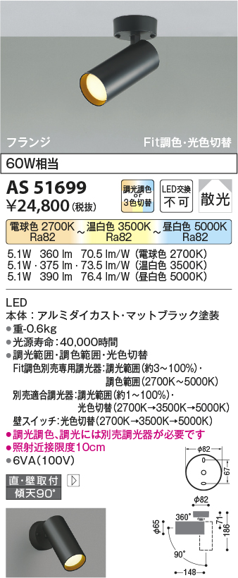 【納期2022.2月〜】コイズミ照明 AS51699 スポットライト Fit調色・光色切替 3光色切替 調光器別売 LED一体型 電球色+昼白色 散光 フランジタイプ