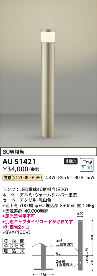 コイズミ照明 AU51421(2梱包) エクステリア ガーデンライト 非調光 LEDランプ 電球色 防雨型 ウォームシルバー [au51421]
