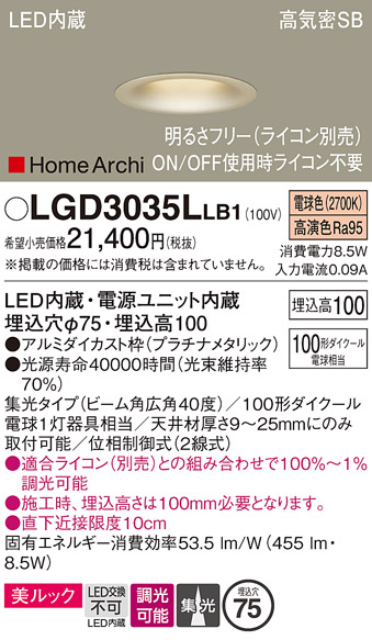 パナソニック LGD3035LLB1 ダウンライト 天井埋込型 LED(電球色) 美ルック 高気密SB形 集光40度 広角 調光(ライコン別売) 埋込穴φ75 プラチナメタリック [lgd3035llb1]