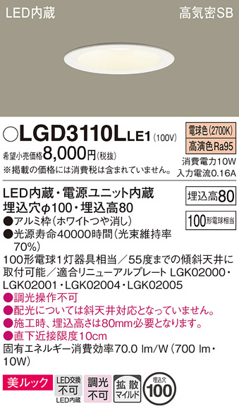 パナソニック LGD3110LLE1 ダウンライト 天井埋込型 LED一体型(電球色) 美ルック 高気密SB形 拡散マイルド配光 埋込穴φ100 ホワイト [lgd3110lle1]