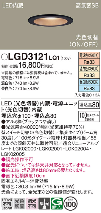 パナソニック LGD3121LQ1 ダウンライト 天井埋込型 LED(昼白色・温白色・電球色) 光色切替タイプ 高気密SB形 集光30度 埋込穴φ100 ブラック