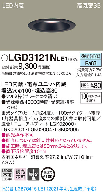 パナソニック LGD3121NLE1 ダウンライト 天井埋込型 LED(昼白色) 高気密SB形 集光24度 埋込穴φ100 ブラック