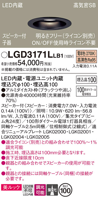 パナソニック LGD3171LLB1 ダウンライト 天井埋込型 LED(電球色) 美ルック 高気密SB形 集光24度 調光(ライコン別売) スピーカー付 埋込穴φ100 ブラック [lgd3171llb1]