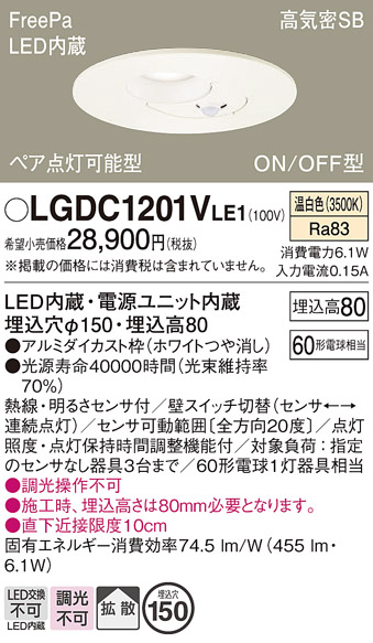 パナソニック LGDC1201VLE1 ダウンライト 天井埋込型 LED(温白色) 高気密SB形 拡散タイプ FreePa ペア点灯型 ON/OFF型 明るさセンサ付 埋込穴φ150 ホワイト [lgdc1201vle1]
