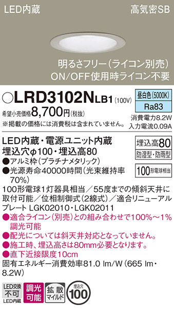 パナソニック LRD3102NLB1 軒下用ダウンライト 天井埋込型 LED(昼白色) 拡散マイルド配光 防湿・防雨型 調光(ライコン別売) 埋込穴φ100 プラチナメタリック [lrd3102nlb1]