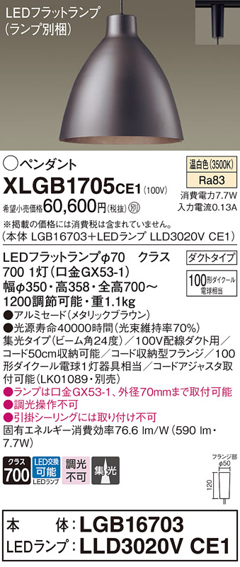 パナソニック XLGB1705CE1(ランプ別梱) ペンダント LED(温白色) 吊下型 アルミセードタイプ 集光24度 ダクトタイプ メタリックブラウン [xlgb1705ce1]