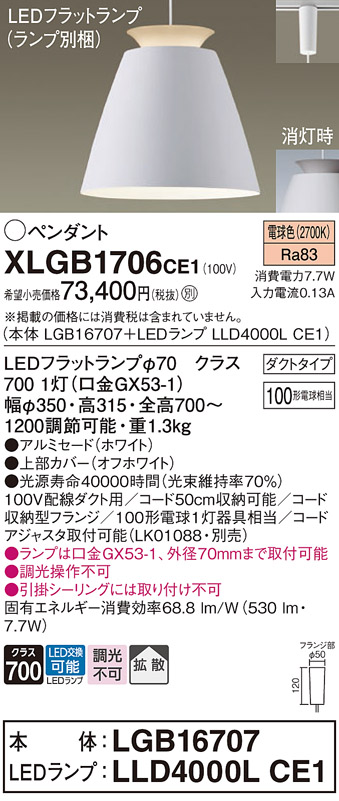 パナソニック XLGB1706CE1(ランプ別梱) ペンダント LED(電球色) 吊下型 アルミセードタイプ 拡散タイプ ダクトタイプ ホワイト
