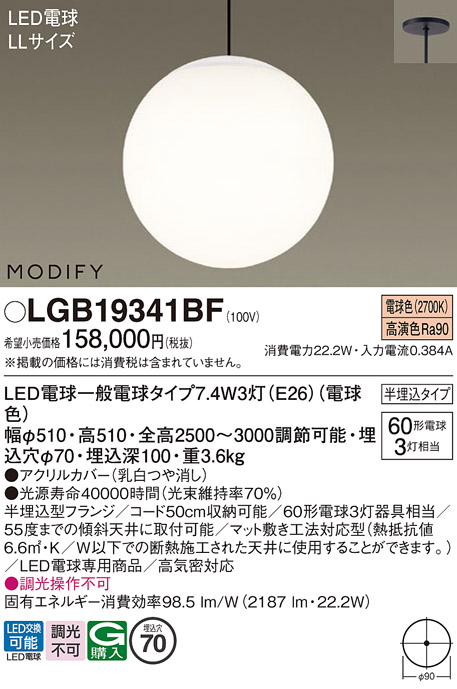 パナソニック LGB19341BF ペンダント ランプ同梱 LED(電球色) 吹き抜け用 吊下型 半埋込タイプ モディファイ ブラック [lgb19341bf]