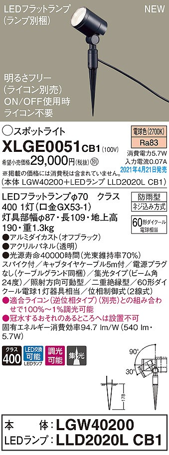 パナソニック XLGE0051CB1(ランプ別梱) エクステリア スポットライト LED(電球色) スパイク取付型 集光24度 防雨型 調光(ライコン別売) オフブラック [xlge0051cb1]
