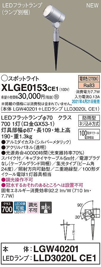 パナソニック XLGE0153CE1(ランプ別梱) エクステリア スポットライト LED(電球色) スパイク取付型 集光24度 防雨型 シルバーメタリック [xlge0153ce1]