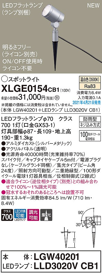 パナソニック XLGE0154CB1(ランプ別梱) エクステリア スポットライト LED(温白色) スパイク取付型 集光24度 防雨型 調光(ライコン別売) シルバーメタリック