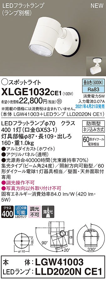 パナソニック XLGE1032CE1(ランプ別梱) エクステリア スポットライト LED(昼白色) 天井・壁直付型 集光24度 防雨型 ホワイト