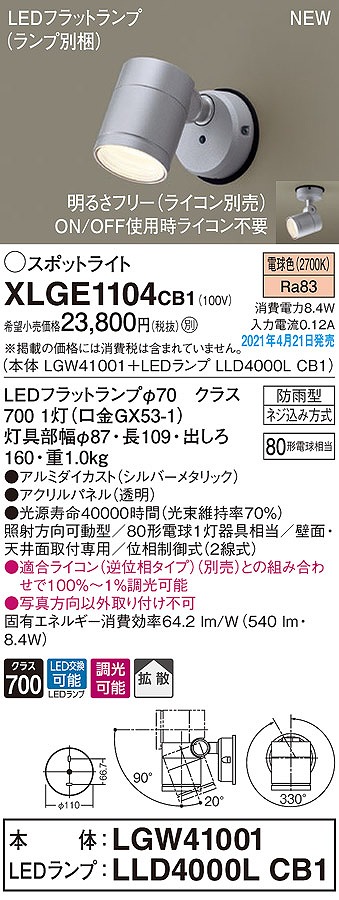 パナソニック XLGE1104CB1(ランプ別梱) エクステリア スポットライト LED(電球色) 天井・壁直付型 拡散タイプ 防雨型 調光(ライコン別売) シルバーメタリック