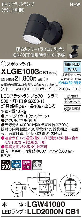パナソニック XLGE1003CB1(ランプ別梱) エクステリア スポットライト LED(昼白色) 天井・壁直付型 拡散タイプ 防雨型 調光(ライコン別売) オフブラック