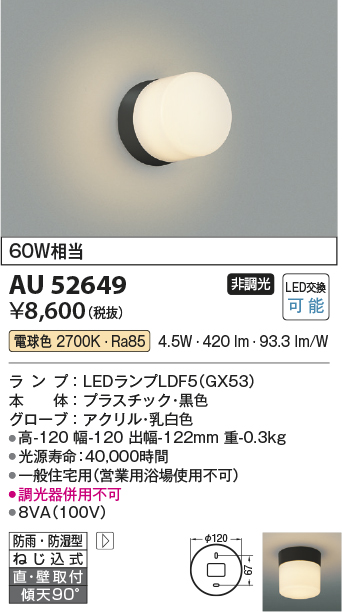 コイズミ照明 AU52649 エクステリアライト 勝手口灯 非調光 LEDランプ交換可能型 電球色 直付・壁付取付 防雨・防湿型 ブラック [au52649]