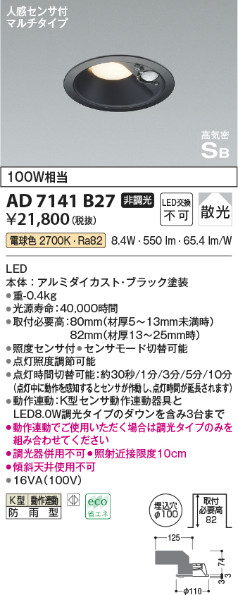 コイズミ照明 AD7141B27 エクステリアライト ダウンライト φ100 非調光 LED一体型 電球色 ベースタイプ 高気密SB 防雨型 人感センサ付 ブラック