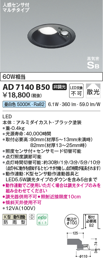コイズミ照明 AD7140B50 エクステリアライト ダウンライト φ100 非調光 LED一体型 昼白色 ベースタイプ 高気密SB 防雨型 人感センサ付 ブラック
