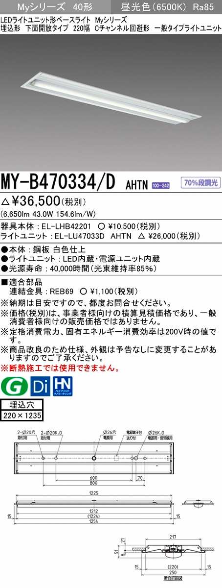 三菱 MY-B470334/D AHTN LEDライトユニット形ベースライト 埋込形下面開放タイプ220幅 一般タイプ 固定出力 昼光色 受注生産品 [§] [my-b470334-dahtn]