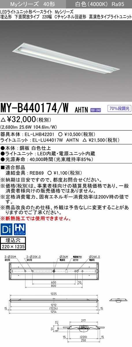 三菱 MY-B440174/W AHTN LEDライトユニット形ベースライト 埋込形下面開放タイプ220幅 高演色タイプ(Ra95) 固定出力 白色 受注生産品 [§] [my-b440174-wahtn]