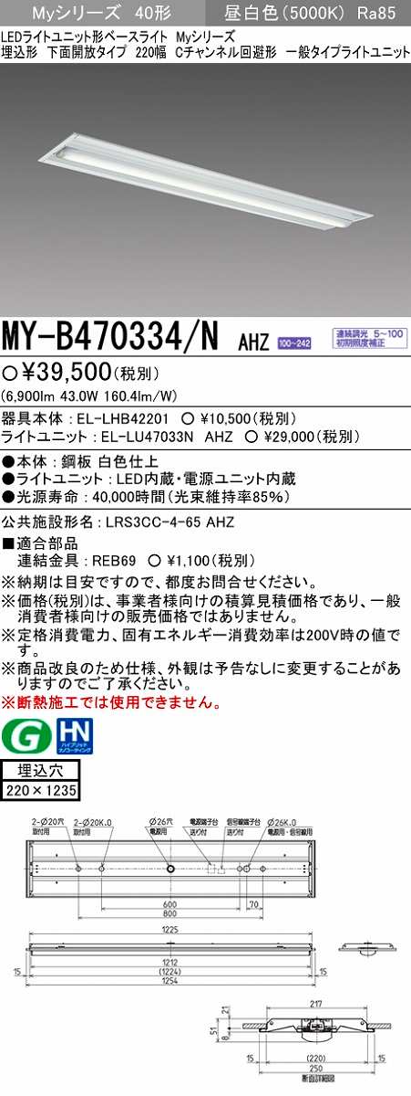 【メーカー品薄】三菱 MY-B470334/N AHZ LEDライトユニット形ベースライト 埋込形下面開放タイプ220幅 一般タイプ 初期照度補正付連続調光 昼白色 [my-b470334-nahz]