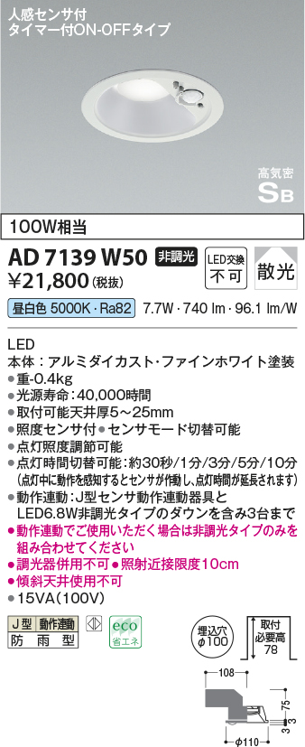 コイズミ照明 AD7139W50 LED防雨型ダウンライト LED一体型 非調光 人感センサ タイマー付ON-OFFタイプ 昼白色 ファインホワイト
