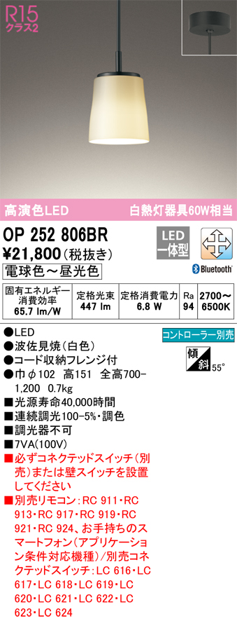 オーデリック OP252806BR ペンダントライト 調光 調色 Bluetooth コントローラー別売 和風 LED一体型 電球色〜昼光色 フレンジタイプ 波佐見焼 [op252806br]