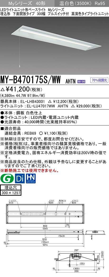 三菱 MY-B470175S/WW AHTN LEDライトユニット形ベースライト 埋込形下面開放300幅プルスイッチ付 高演色(Ra95) 固定出力 温白色 受注生産品 [§]