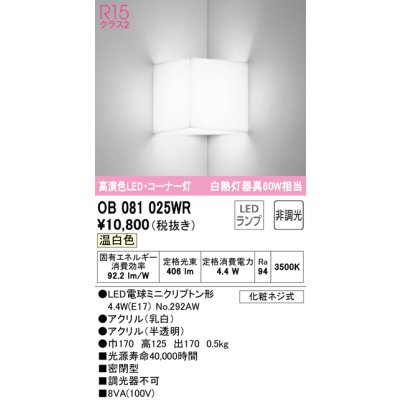 オーデリック OB081025WR(ランプ別梱) ブラケットライト コーナー灯 非調光 LEDランプ 温白色 [ob081025wr]